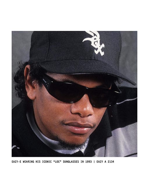 EAZY is a limited-edition frame inspired by Eazy-E's iconic "loc" sunglasses featuring a wrap-around design that faithfully embodies details of shades worn by the OG icon.