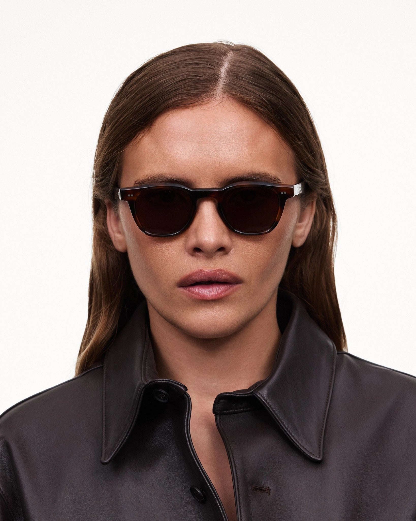 01 is a classic rounded silhouette with a sculptural temple construction. Fitted with UV-protective CR39 lenses, silver-toned rivet hinges and finished with a beveled brow for an elegant profile.