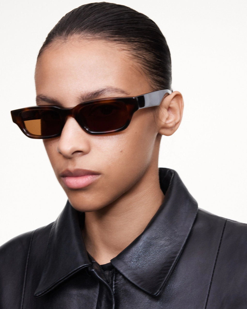 10 is a slim rectangular silhouette, creating a sharp look with a low-slung profile sitting comfortably on the bridge of the nose. Fitted with UV-protective CR39 lenses.