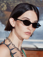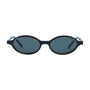 A petite oval frame featuring inner gold metal detailing paired with a black acetate and black CAT 3 UV-protected lenses.